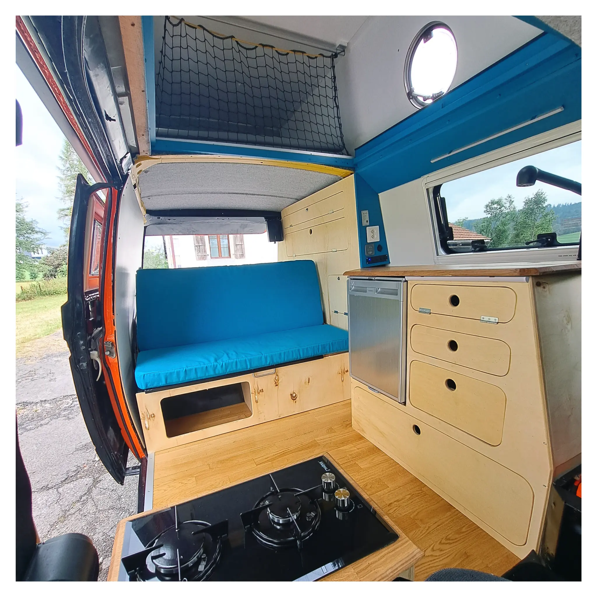 Aménagement complet pour 3 personnes avec tout le confort nécessaire pour l'aventure. Intérieur réalisé sur mesure selon les goûts et les aspects demandés par le client.